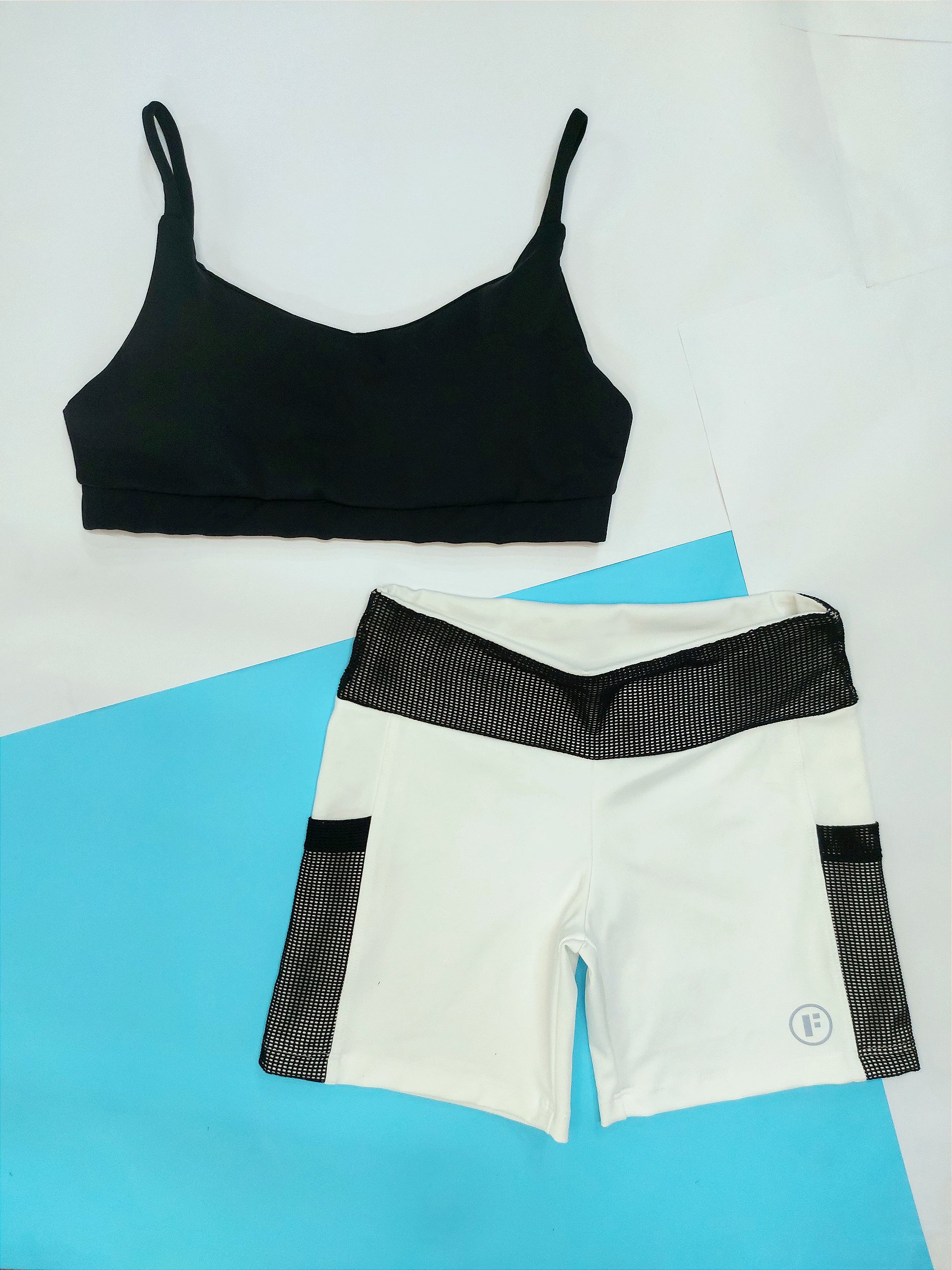 Short branco com tela e bolsos laterais. Top básico de alcinha com bojo.